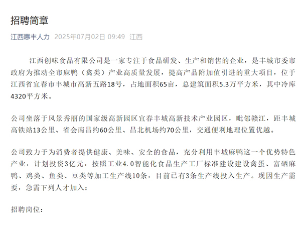 江西創(chuàng)味食品有限公司是一家專注于食品研發(fā)、生產(chǎn)和銷售的企業(yè),是豐城市委市政府為推動全市麻鴨(禽類)產(chǎn)業(yè)高質(zhì)量發(fā)展,提高產(chǎn)品附加值引進(jìn)的重大項(xiàng)目,位于江西省宜春市豐城市高新五路18號,占地面積65畝,總建筑面積5.3萬平方米,其中冷庫4320平方米。公司坐落于風(fēng)...